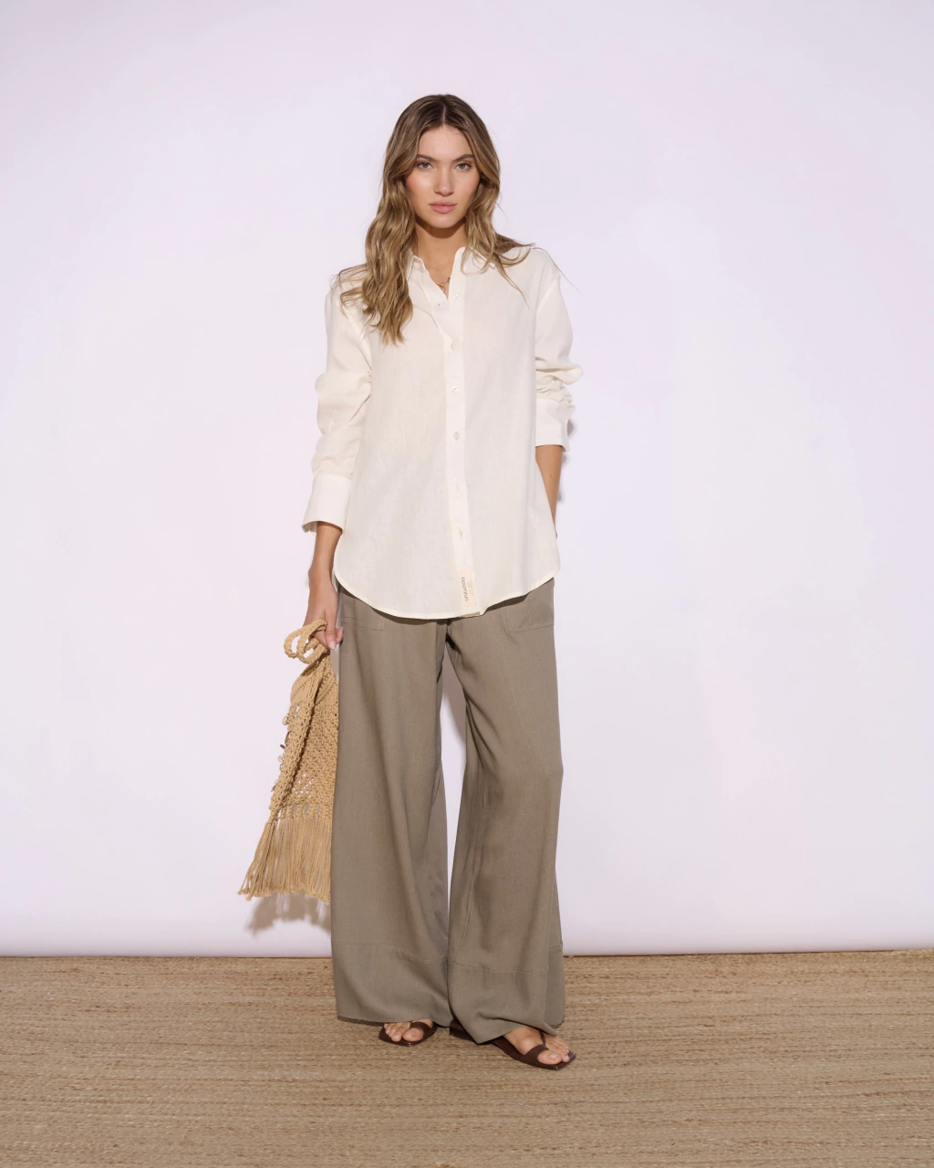 Camisa clásica de lino, de manga larga y calce holgado. Presenta cartera con botones personalizados en el delantero y detalle de etiqueta de algodón de Shibinda en el ruedo. En la espalda cuenta con canesú y doble tablón.