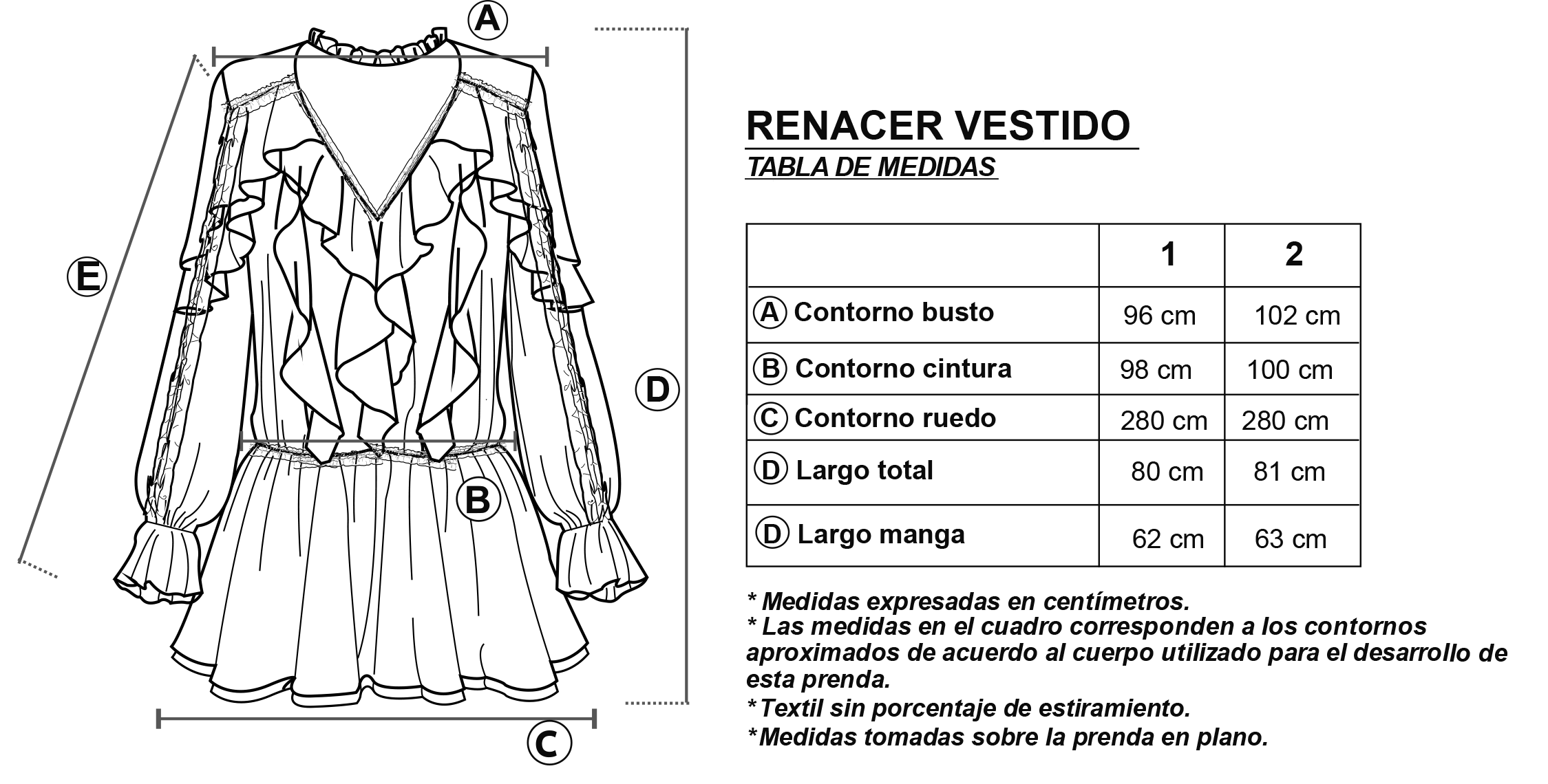 Vestido corto de gasa, puntilla y encaje. con multivolados. Volado de falda forrado con doble gasa.