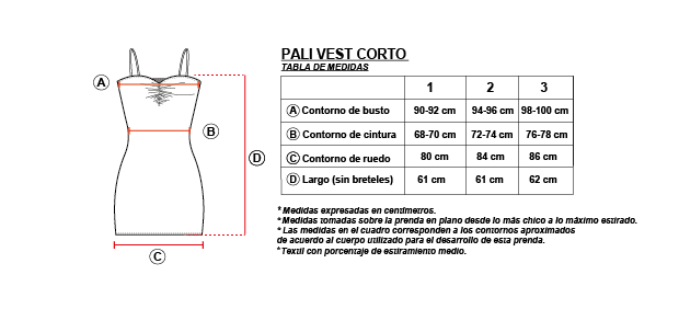 Cuidados: Prenda delicada, no rozar con otras superficies. Cuidar que no se enganche. Lavar a mano con agua fría. No dejar en remojo. No centrifugar. No usar cloro. Usar jabón neutro. Planchar únicamente con vapor. Secar a la sombra.