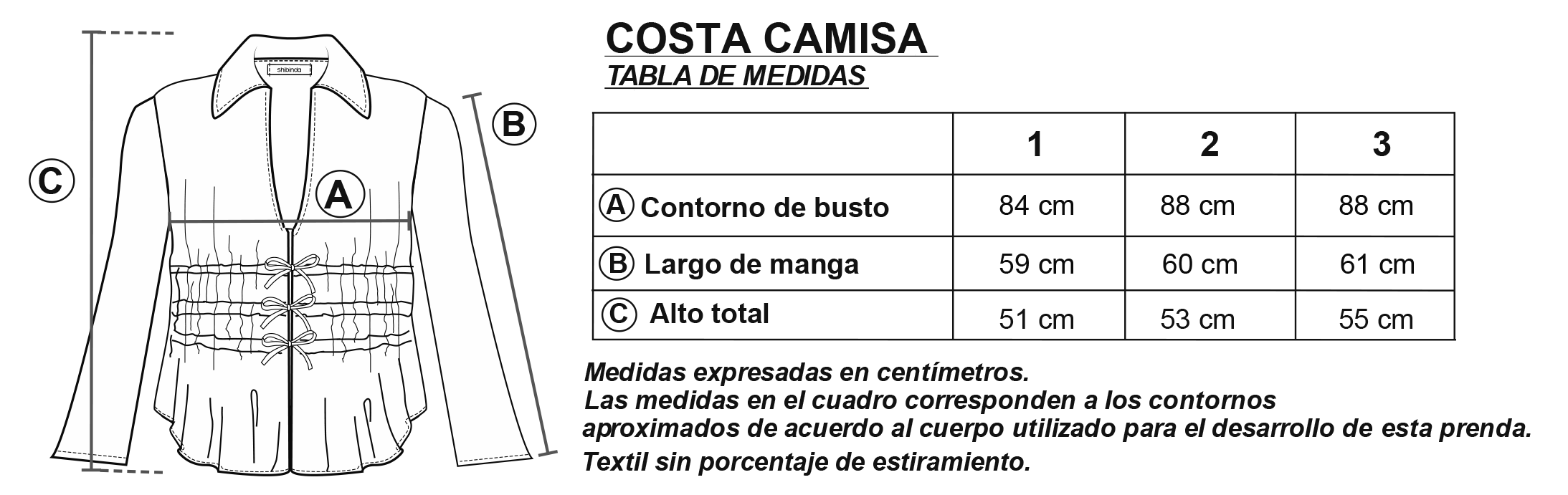 Camisa de algodón manga larga escote profundo con detalle de frunces en todo el contorno de cintura con lazos para atar en delantero. En espalda tiene canesú doble.