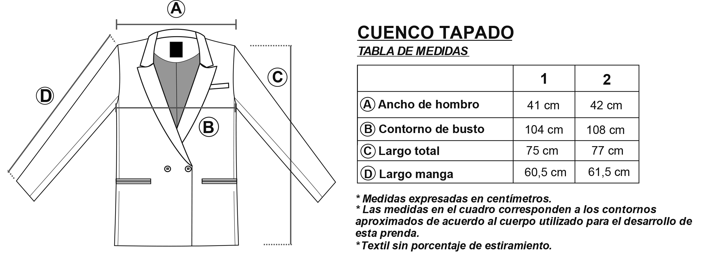 Composición: 65% Poliéster, 33% Rayón, 2% Spandex. Forrería: 100% Poliéster.