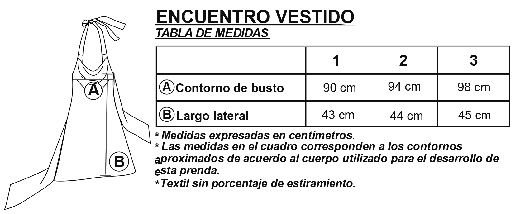 Vestido corto en satén, cuello halter alto que cae en buche. Se prende en cuello mediante lazo que se ata. Largo asimétrico con tiras en satén que caen en laterales. Todo forrado.