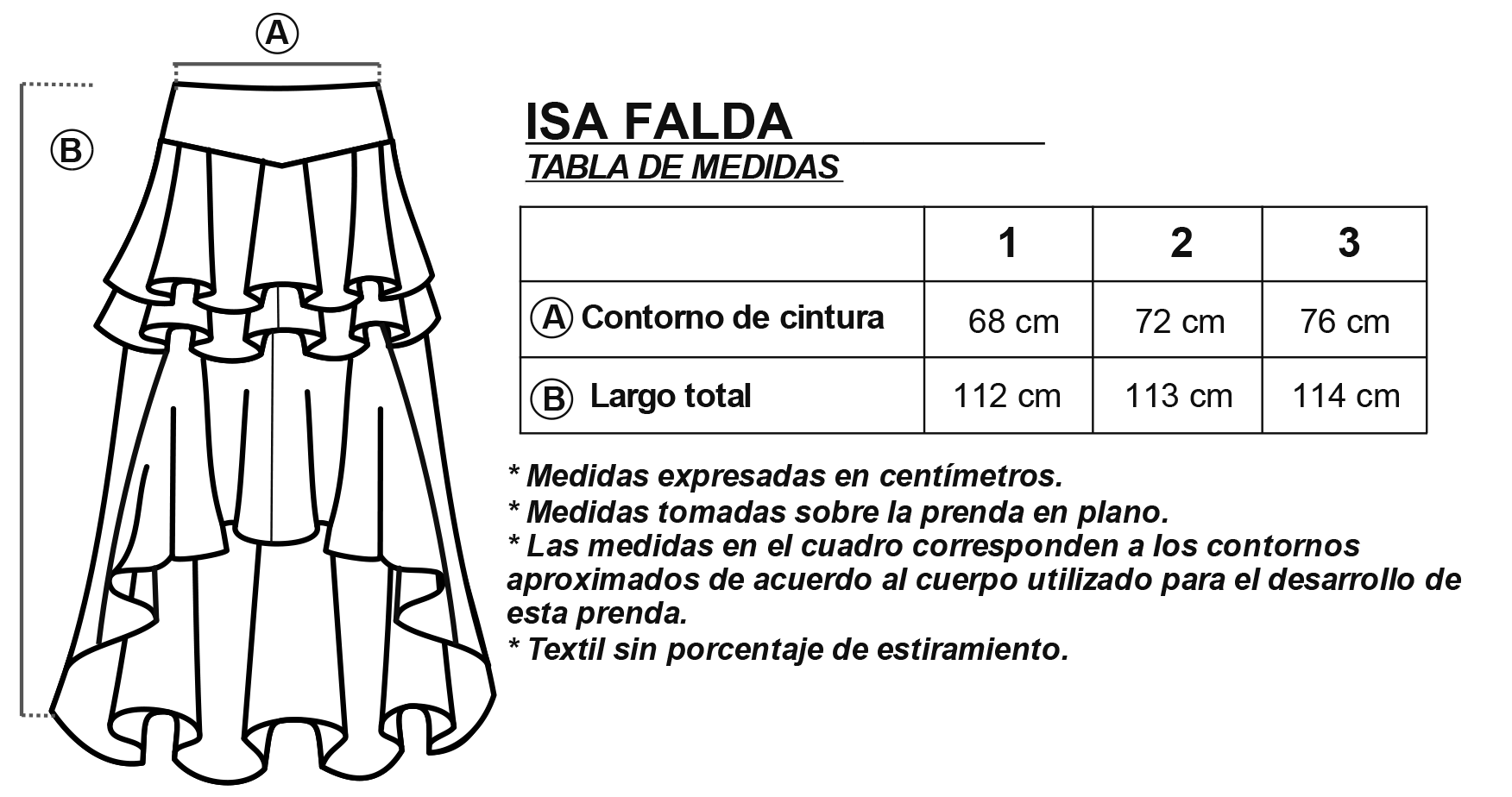 Falda confeccionada en gasa con volados escalonados que aportan movimiento. Su diseño asimétrico —más corto en el delantero y largo en la espalda— realza la silueta. Cuenta con cierre lateral y está completamente forrada para un mejor acabado.