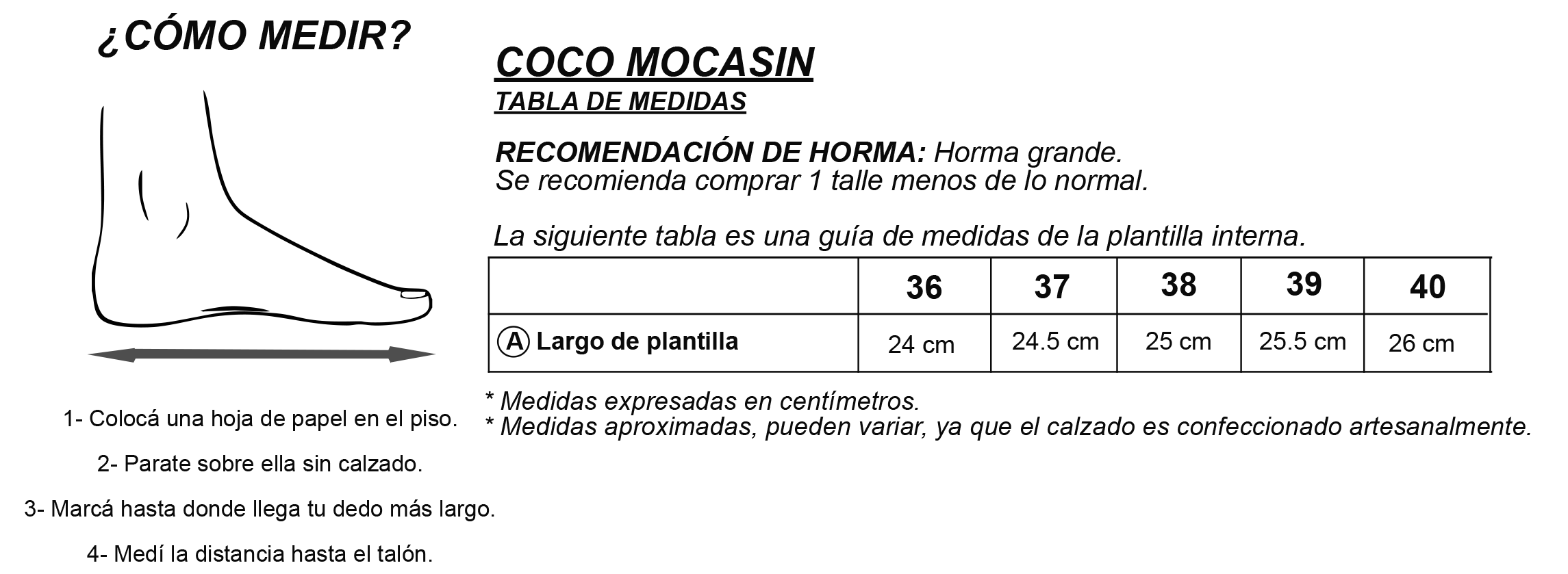 PARA UN AJUSTE MÁS CÓMODO, TE RECOMENDAMOS ELEGIR UN TALLE MENOS DEL HABITUAL, YA QUE ES UNA HORMA GRANDE.