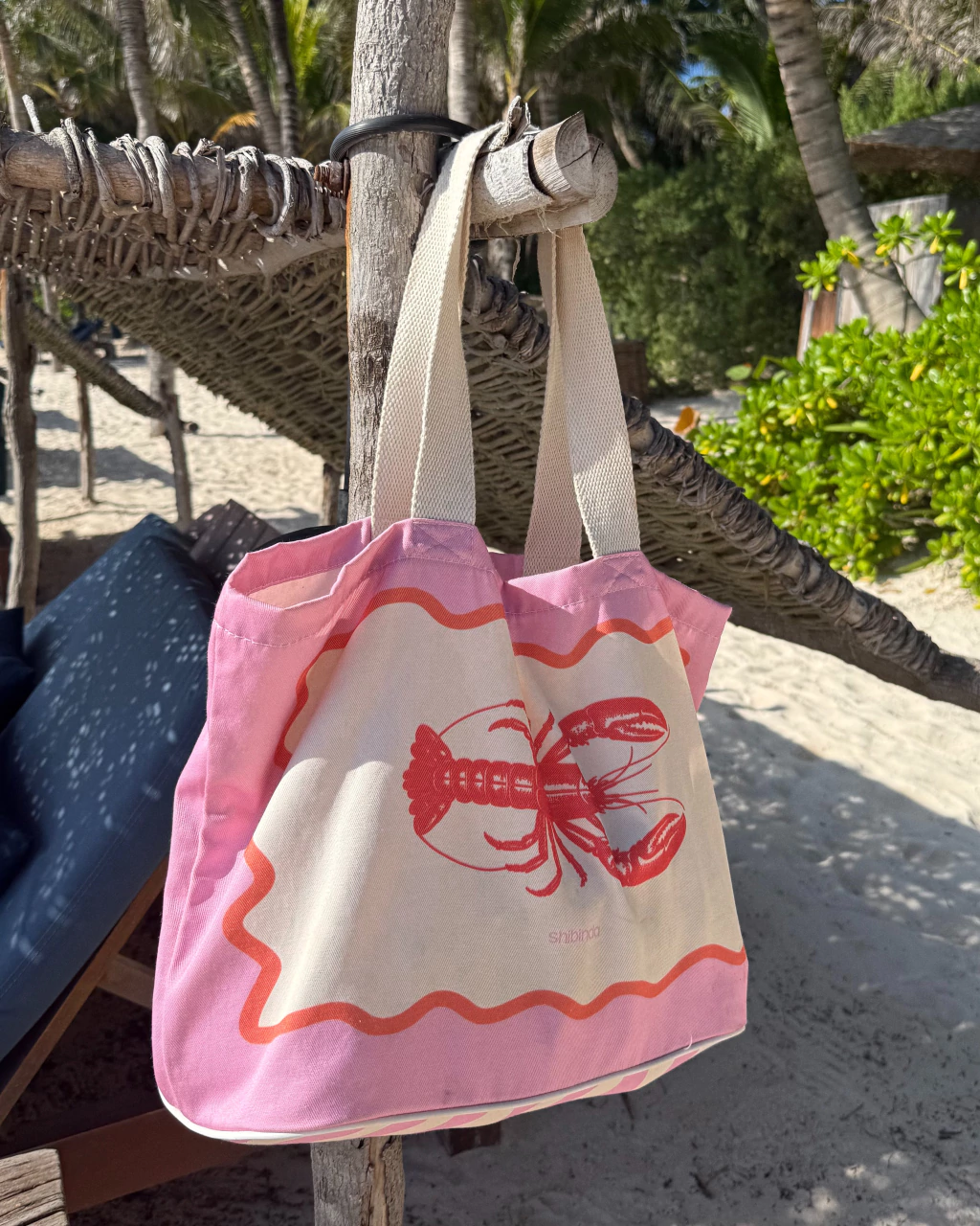 Bolso confeccionado en material impermeable, con estampa exclusiva desarrollada por Shibinda. Cuenta con fuelle para mayor capacidad y tiras de algodón resistentes. Presenta diseño dual: una ilustración de langosta en un lateral y la frase “Ciao bella” en el otro, ideal para acompañar días de playa o pileta.