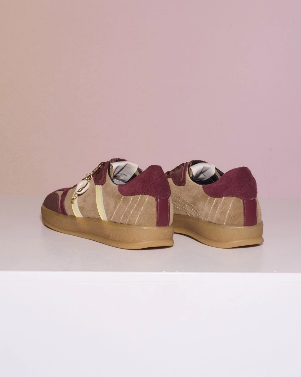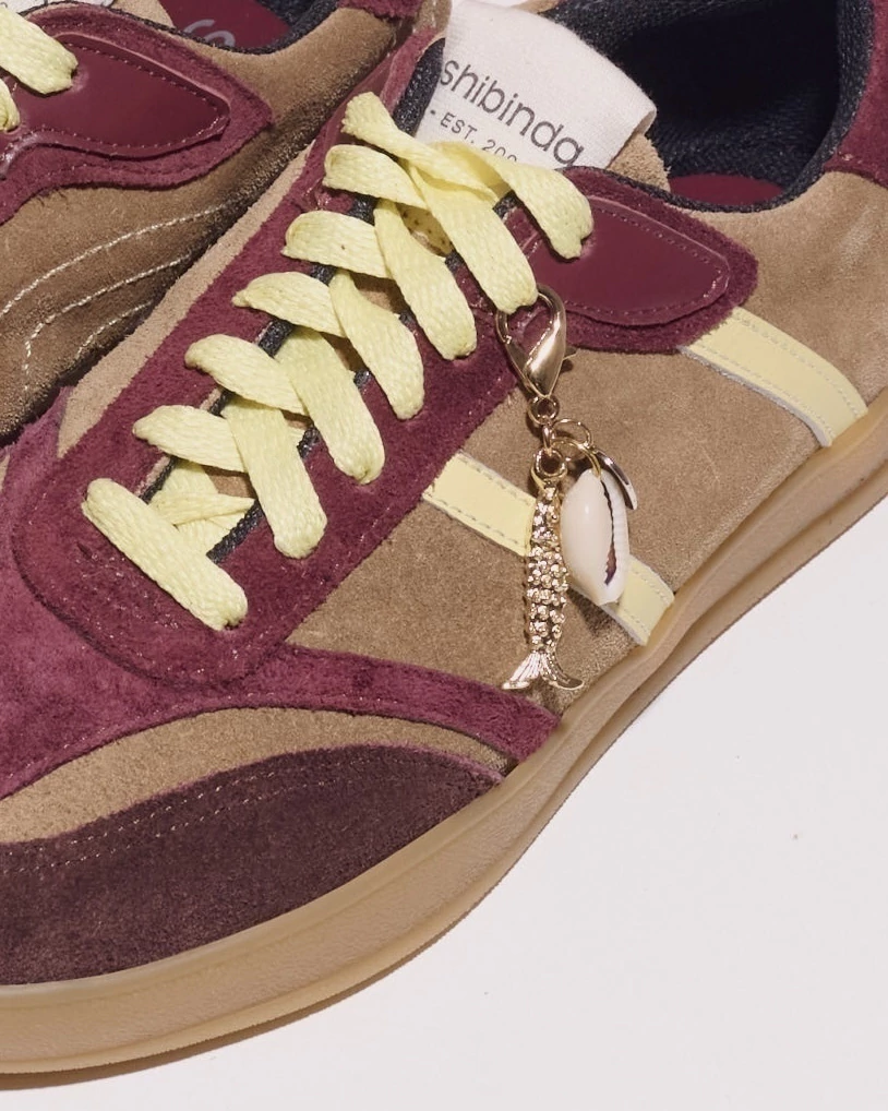 Zapatilla acordonada con diferentes recortes en cuero descarne y cuero, otorgando diferentes texturas. Incluye dos pares de cordones de diferente color (moka y amarillo). Posee charm desmontable con dijes, monedas y piedras. En el interior, la plantilla es de EVA y PU, súper confortable y con identificación.